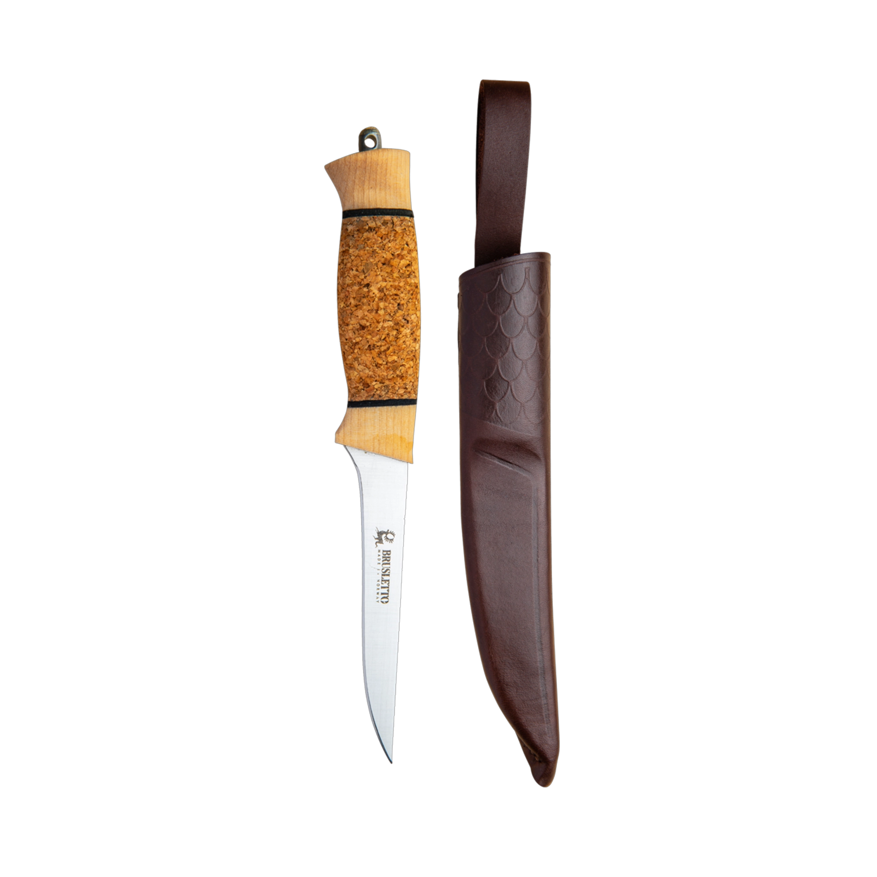 Dette er en perfekt fiskekniv med fleksibelt knivblad og kork i skaftet som holder kniven flytende hvis du er uheldig å mister den i vannet. Skaftet er fleksibelt og er laget av kork og norsk bjørk med gummi-innlegg mellom lagene noe som gir kniven et godt grep selv om den blir våt. Bladet er konslipt og tynt og gjør at kniven er god til å filetere fisk. Bakerst på skaftet er det et hull til å sette snor, hvis man ønsker dette. Sandvik stål i knivbladet som er ekstra holdbart og kork/ oljet bjørk i skaftet. Kniven leveres med lærslire og og en flott gave eske.