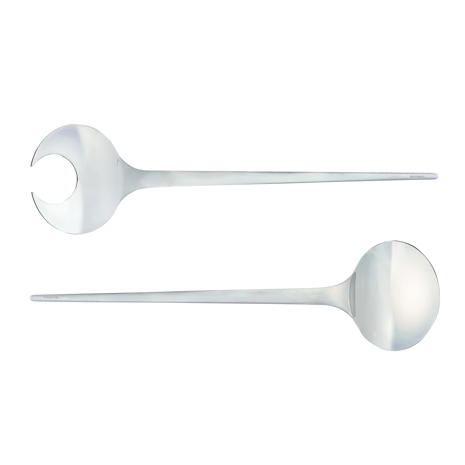 Et moderne serveringssett med skje og gaffel i rustfritt stål. Bestikket ligger behagelig i hånden, og skaftene er prydet med Globals klassiske prikkemønster i minimalistisk design.